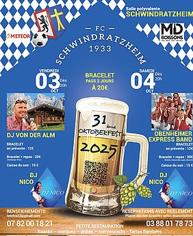Un week-end organisé par le football club de Schwindratzheim sous le signe de l'Oktobefest vous attend à la salle polyvalente du village ! Vendredi soir, ambiance bavaroise avec DJ Nico et DJ Von der Alm, samedi soir c'est l'orchestre Obenheimer Express Band et DJ Nico qui animent la soirée !