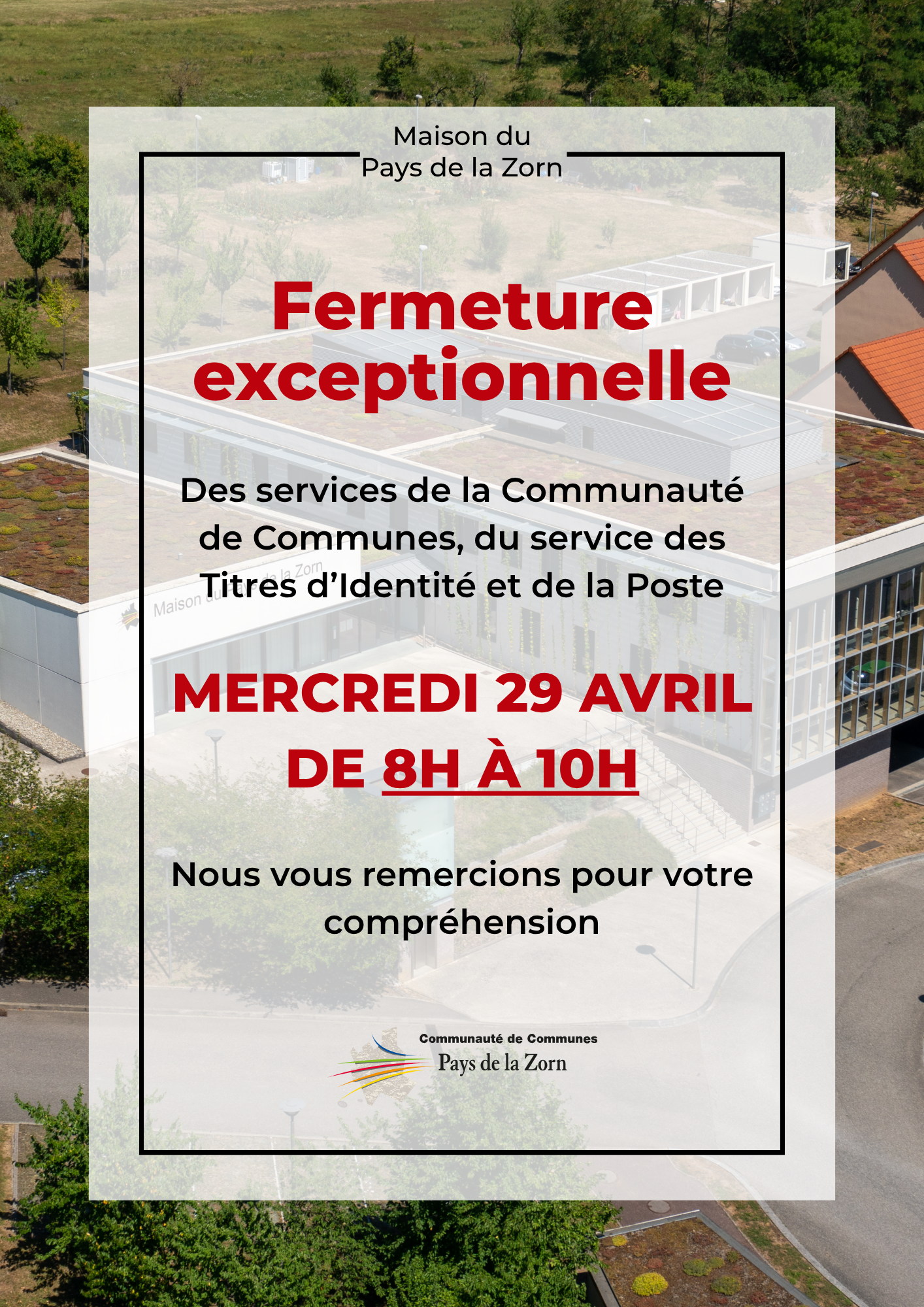 Les services de la Communauté de Communes, le service des Titres d'Identité et la Poste seront exceptionnellement fermés le mercredi 29 avril de 8h à 10h
