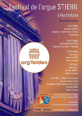 Depuis la restauration de l’orgue STIEHR de Hochfelden en 2023, la chorale Sainte Cécile et son organiste titulaire Michaël MEYER ont à cœur d’organiser des concerts permettant de mettre en lumière l’instrument classé. A l’automne 2024, un premier festival de l’orgue nommé Org’felden a eu lieu avec une série de cinq concerts. Fort de son succès grandissant de semaine en semaine, une nouvelle édition aura lieu à l’automne :