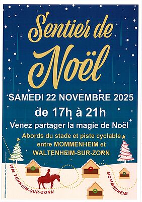 L'association ASCL de Waltenheim sur Zorn en collaboration avec la commune de Mommenheim organise son traditionnel sentier de Noël sur la voie verte entre les deux villages. Tout au long de ce sentier, les visiteurs trouveront différentes animations comme la lettre au Père Noël, un concours de dessin, l’atelier de Contes, l’atelier photo avec le Père Noël, le Saint Nicolas, l’énigme du Père Noël, … ainsi que des créations et produits du terroir d’exposants locaux.