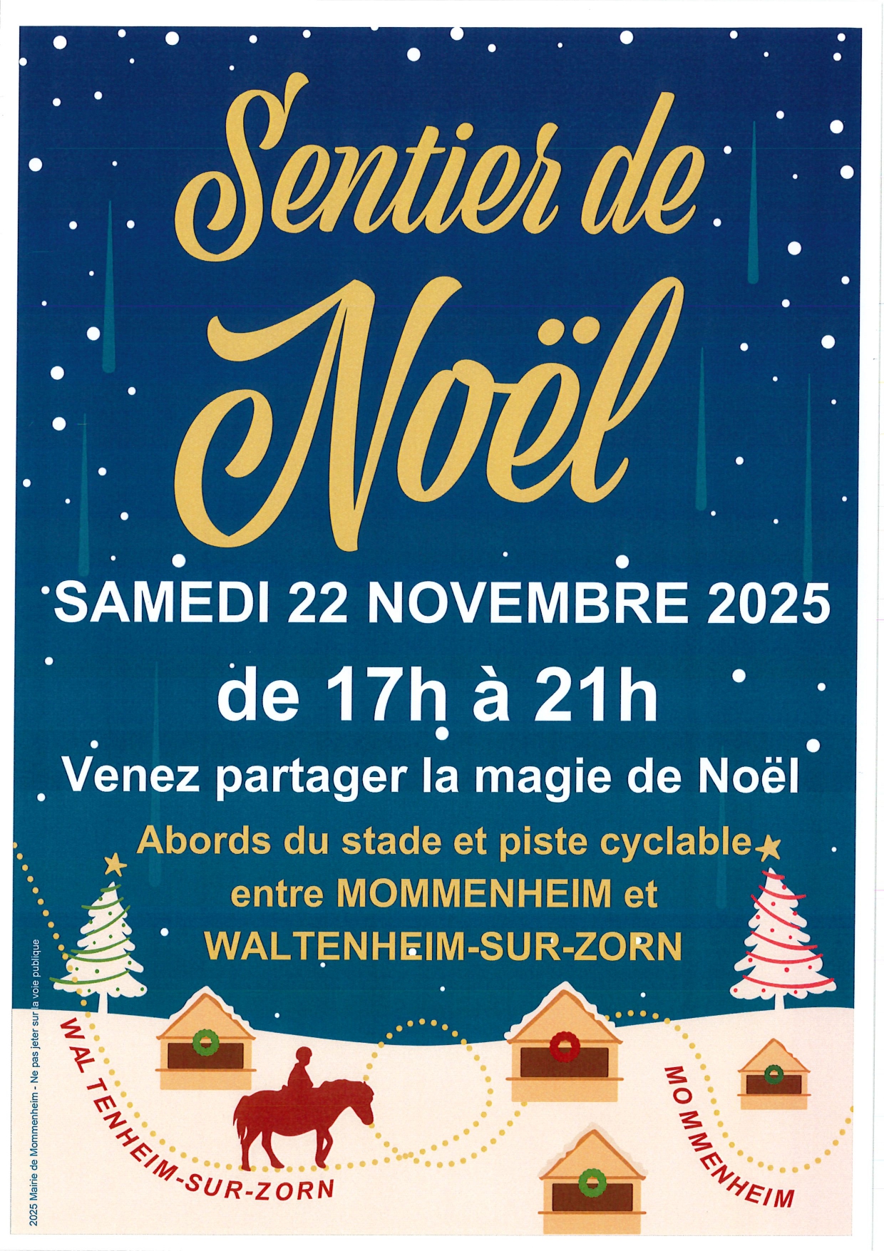 L'association ASCL de Waltenheim sur Zorn en collaboration avec la commune de Mommenheim organise son traditionnel sentier de Noël sur la voie verte entre les deux villages. Tout au long de ce sentier, les visiteurs trouveront différentes animations comme la lettre au Père Noël, un concours de dessin, l’atelier de Contes, l’atelier photo avec le Père Noël, le Saint Nicolas, l’énigme du Père Noël, … ainsi que des créations et produits du terroir d’exposants locaux.