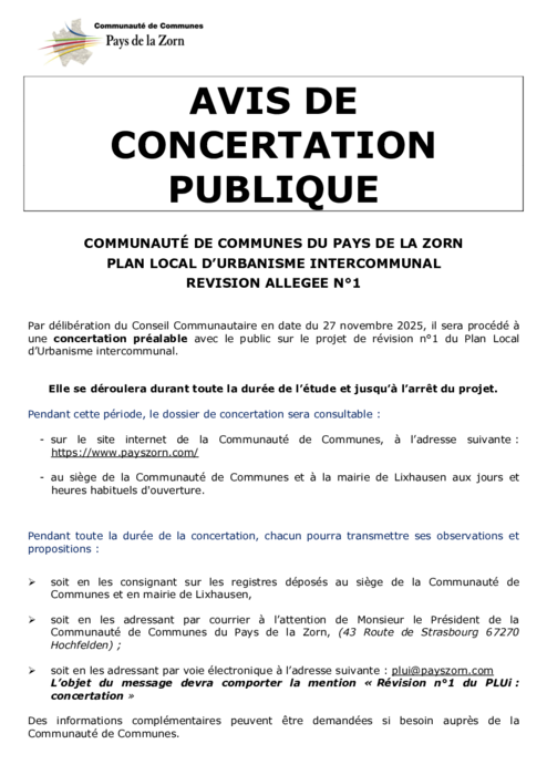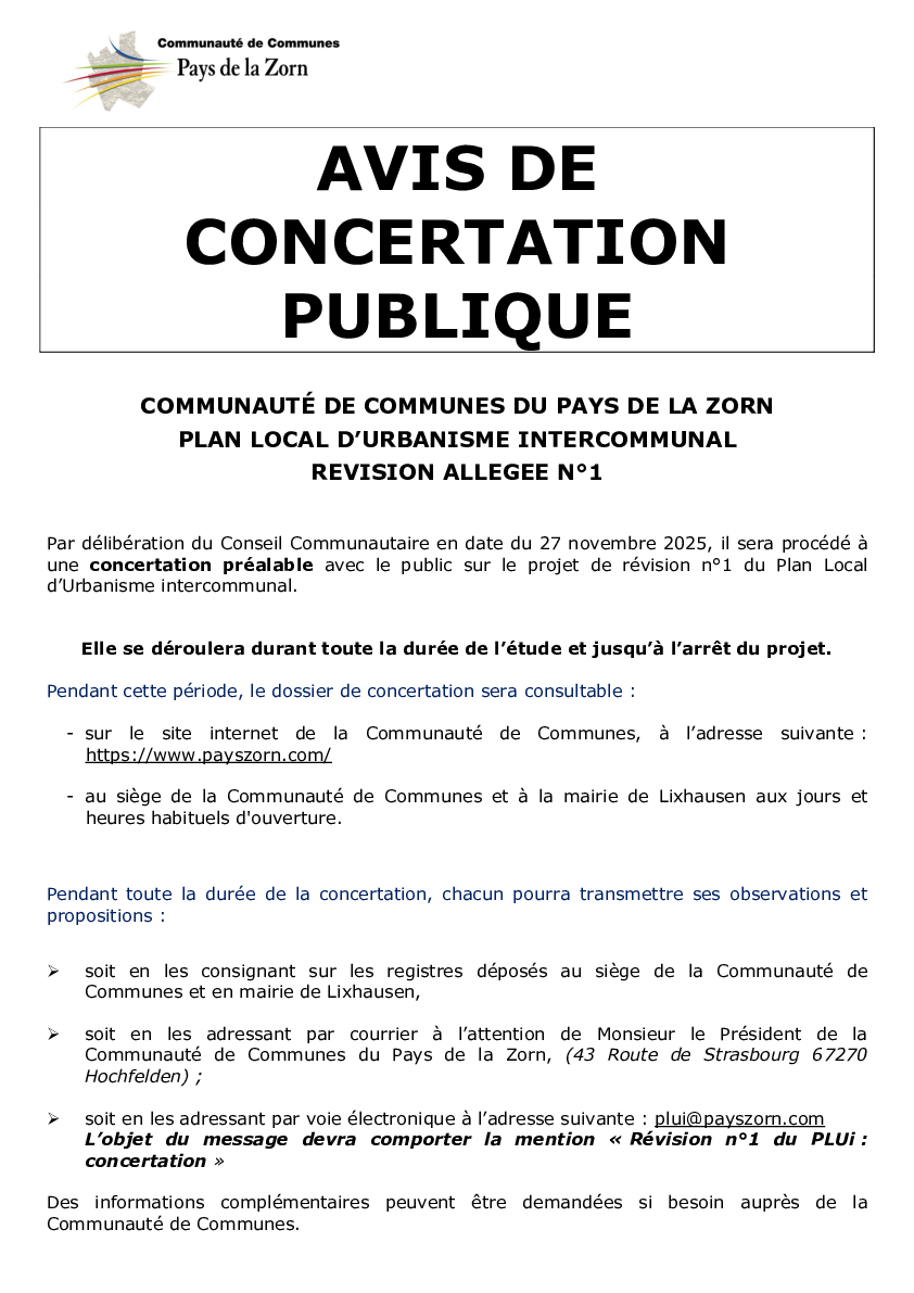 Un registre de concertation est mis à disposition du public au siège de Communauté de Communes du Pays de la Zorn et en mairie de Lixhausen.