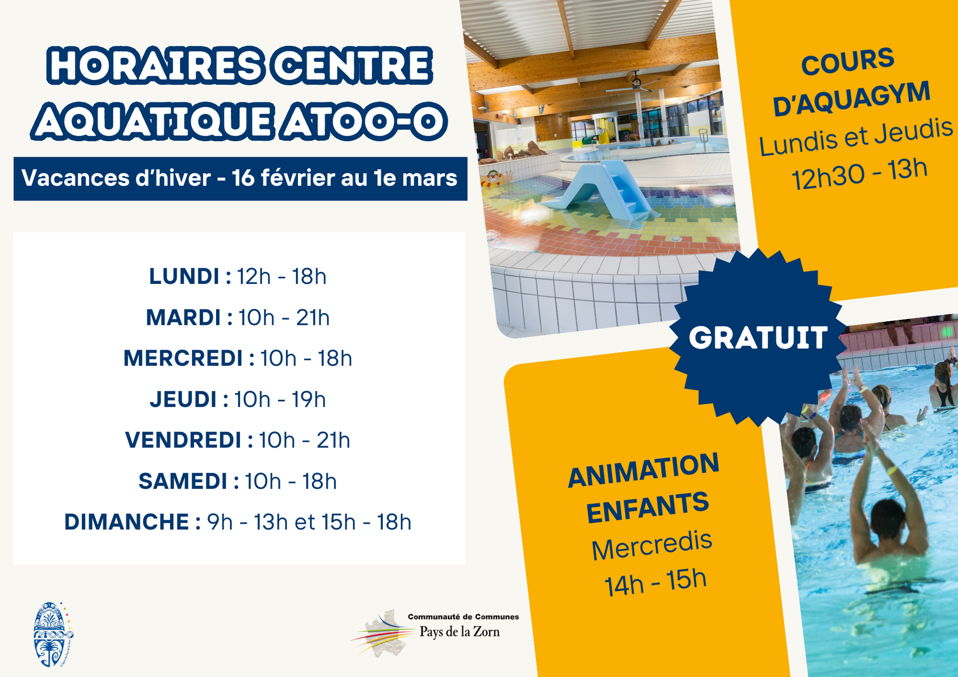 Accueil > Sortir et Découvrir > Sortir au Pays de la Zorn > Le centre aquatique Atoo-o > Les horaires d'ouverture